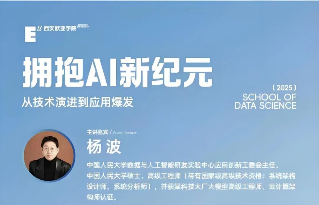 专家讲座,拥抱AI新纪元。课程中邀请中国人民大学数据与人工智能研发实验中心应用创新工委会主任杨波担任主讲嘉宾,聚焦AI新纪元的技术演进与应用爆发,解析四大核心议题:大模型从专精到多模态的进化路径及轻量化、垂直化趋势;消费端生成式内容与产业端质检系统 等落地案例;数据-模型-算力协同驱动的发展逻辑;为经济统计学专业学生夯实基础、培养行业感知与跨界思维的应对策略,以及职业发展提供方向指引。杨波主任带着学生从应用者视角展开对AI大模型选择,让经济统计学学生深切认识到在AI新纪元的浪潮下,应当深度融合技术演进,产业实践与职业发展。